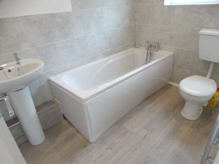 Modern white suite installed in 2018 comprising panelled bath with mixer tap and shower spray attachment, pedestal wash hand basin, low level dual flush WC. Double glazed frosted window. Extractor fan. Tall ladder chromium heated towel radiator.